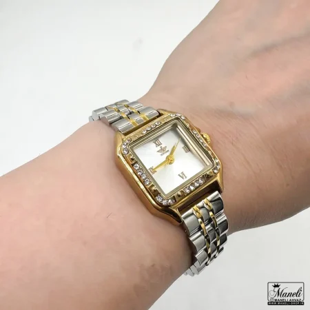 - زیبایی خیرهکننده و ظرافت بیبدیل: طراحی ساعت صفحه مربع و ترکیب رنگ طلایی-نقرهای، در کنار نگینهای درخشان دور قاب، جلوهای منحصربهفرد و چشمنواز خلق کرده است.