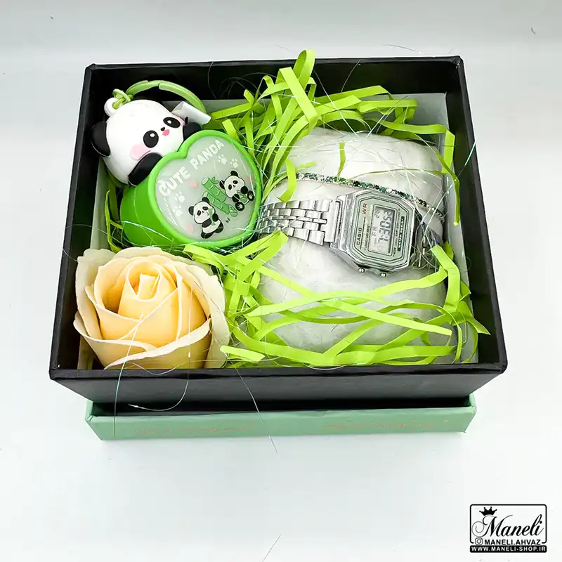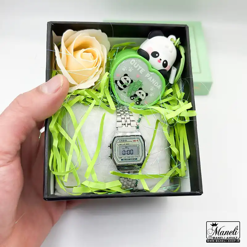 ساعت مچی کاسیو ظریف و دخترانه صفحه سبز، 1 عدد گل ، پوشال ، دستبند کشی با نگین های سبز ، جاکلیدی پاندا چراغدار رنگ سبز |