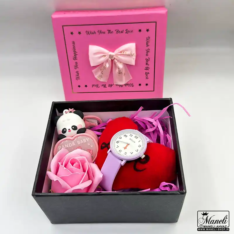 ساعت مچی دخترانه بند سیلیکونی،1عدد گل ، پوشال ، بالشتک قلبی(جاکلیدی) ، جاکلیدی بچه پاندا (چراغدار) صورتی |