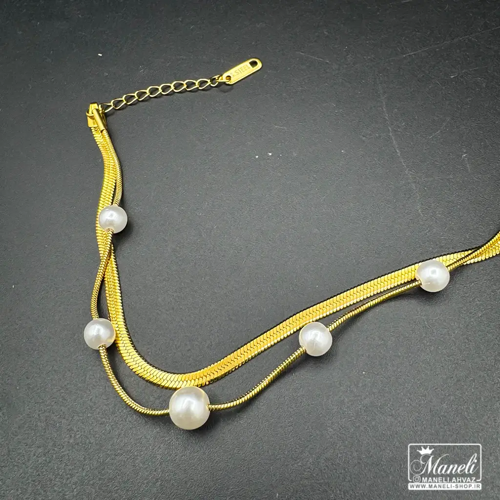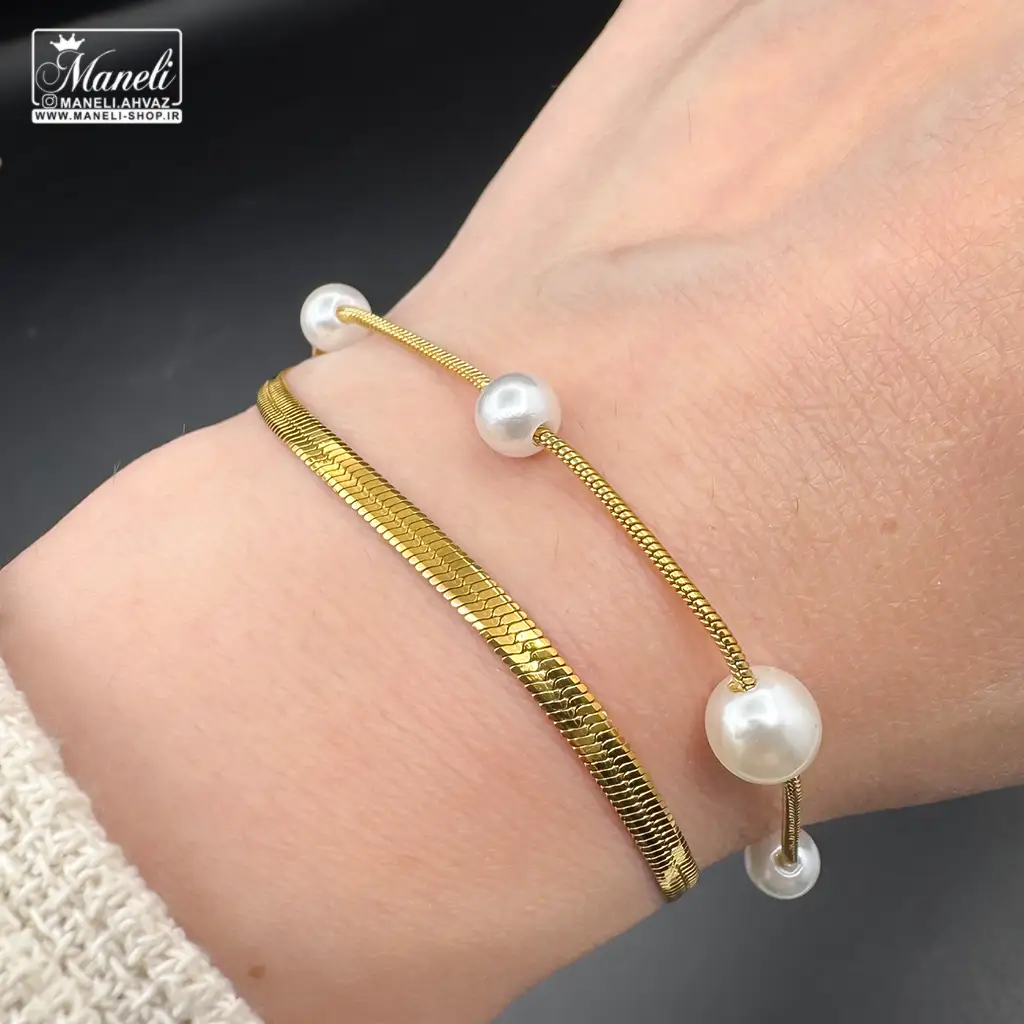 دستبند زنانه دوردیفه هرینگبون و مرواریدی طلایی