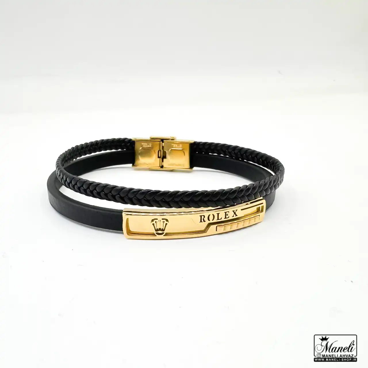 دستبند مردانه چرم با پلاک طلایی رولکس – نمادی از قدرت و ظرافت