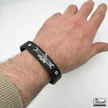 دستبند مردانه چرم با پلاک فروهر استیل رنگ نقره ای