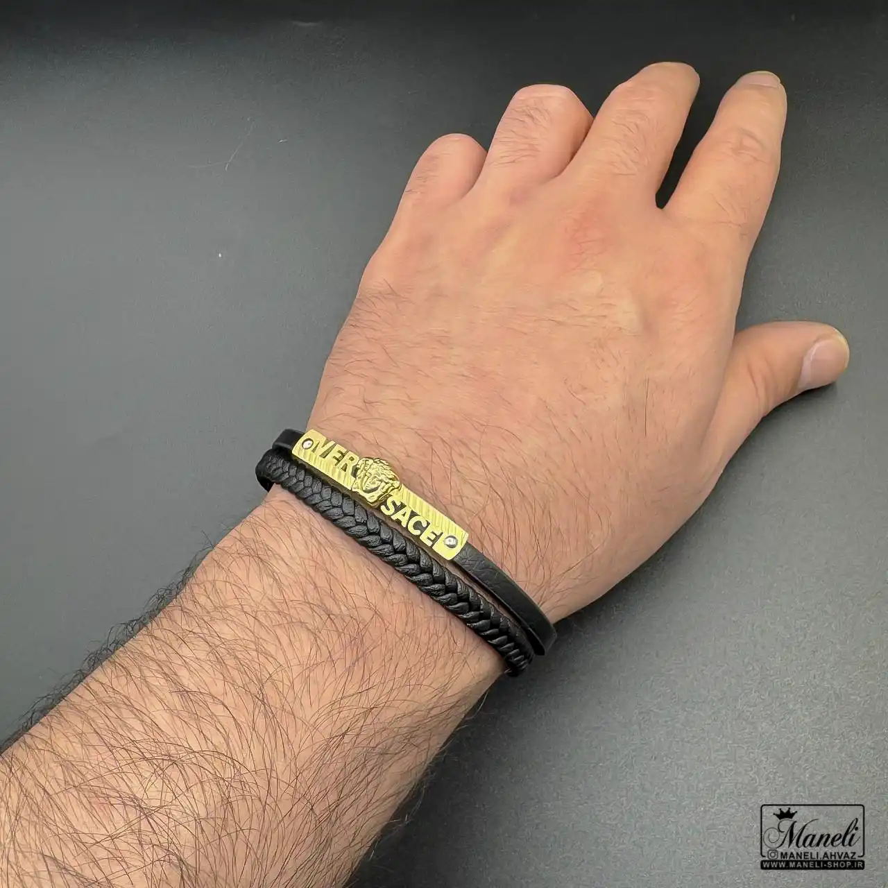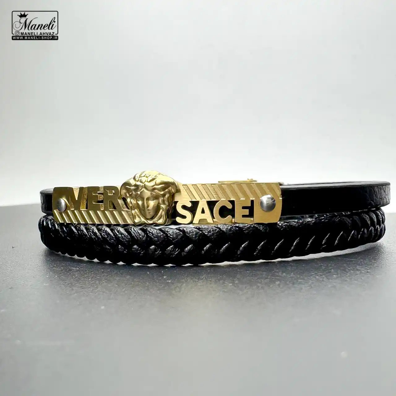 دستبند مردانه چرم با پلاک ورساچه طلایی؛ شکوه همیشه ماندگار