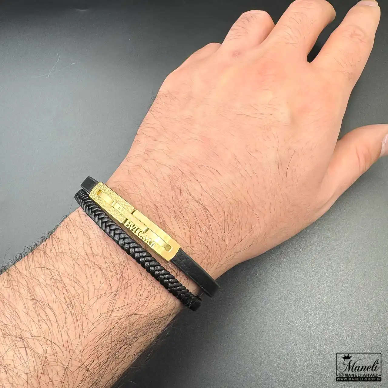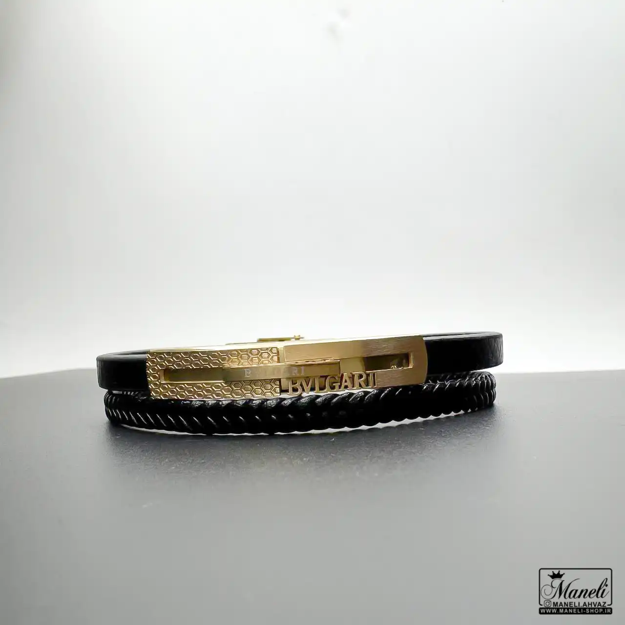 زیبایی و قدرت در دستان شما: دستبند مردانه چرم دوردیفه با پلاک طلایی BVLGARI