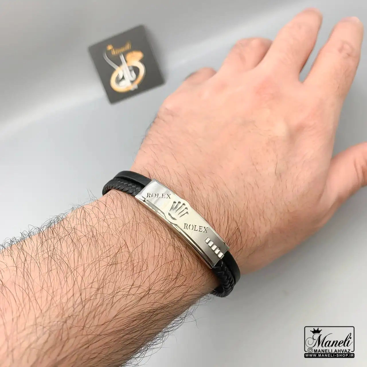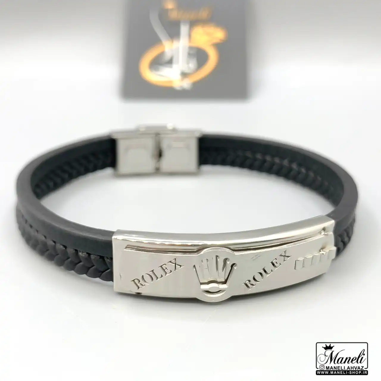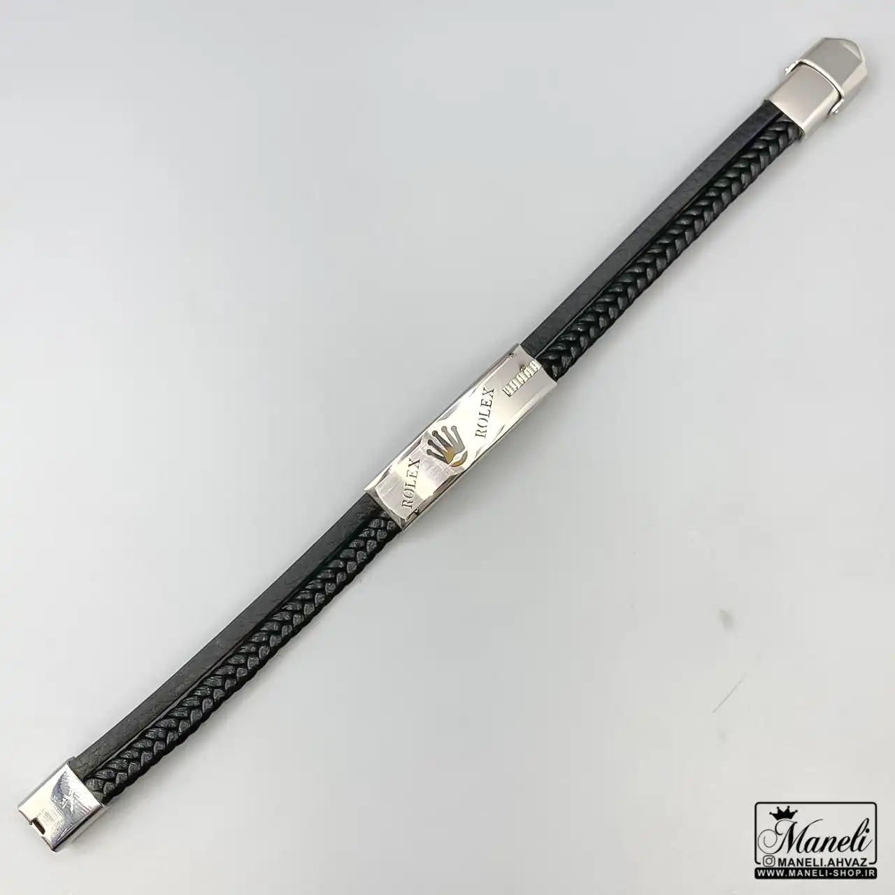 دستبند مردانه چرم دوردیفه با پلاک رولکس نقره ای ؛ تلفیق قدرت، سبک و اصالت در استایل شما