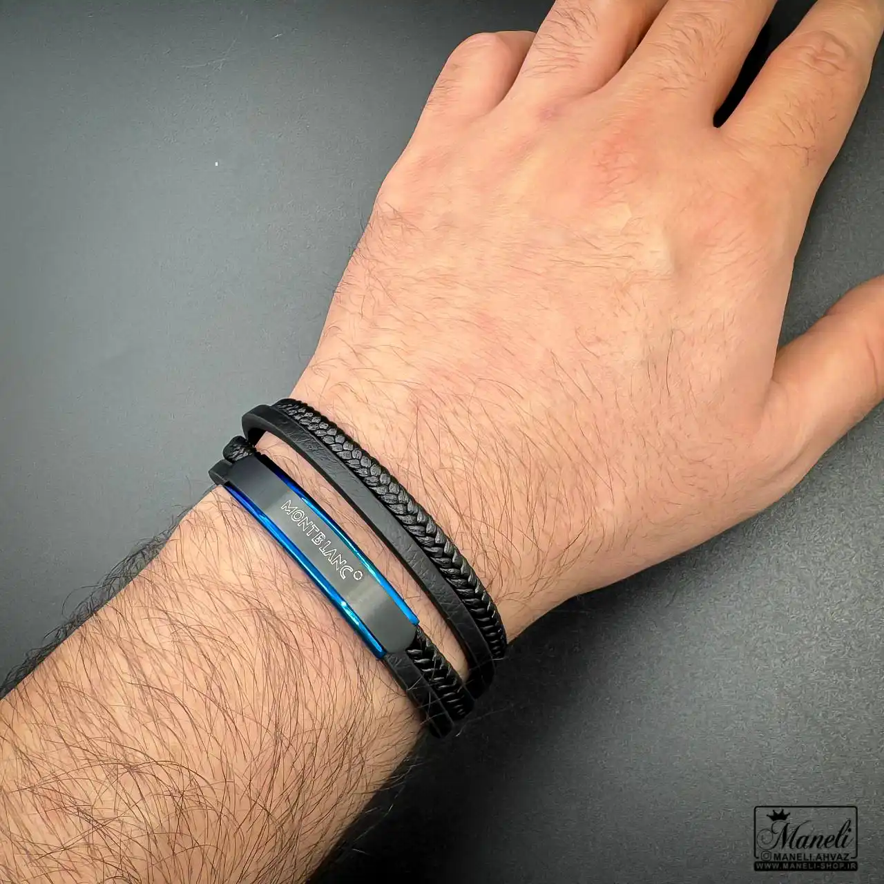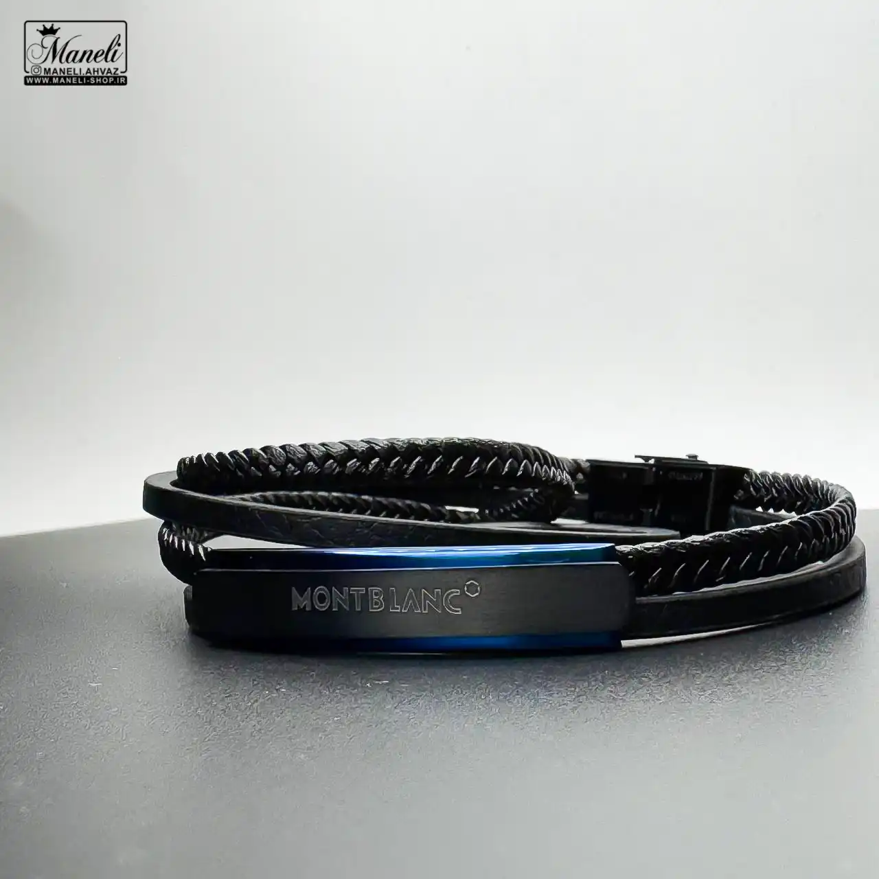 دستبند مردانه چرم دو دور و دو لاین مونت بلانک با پلاک آبی
