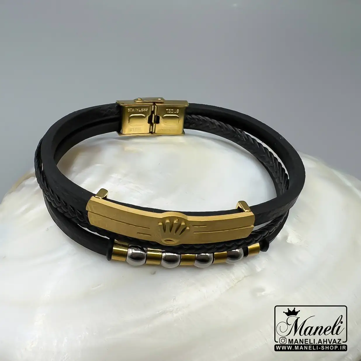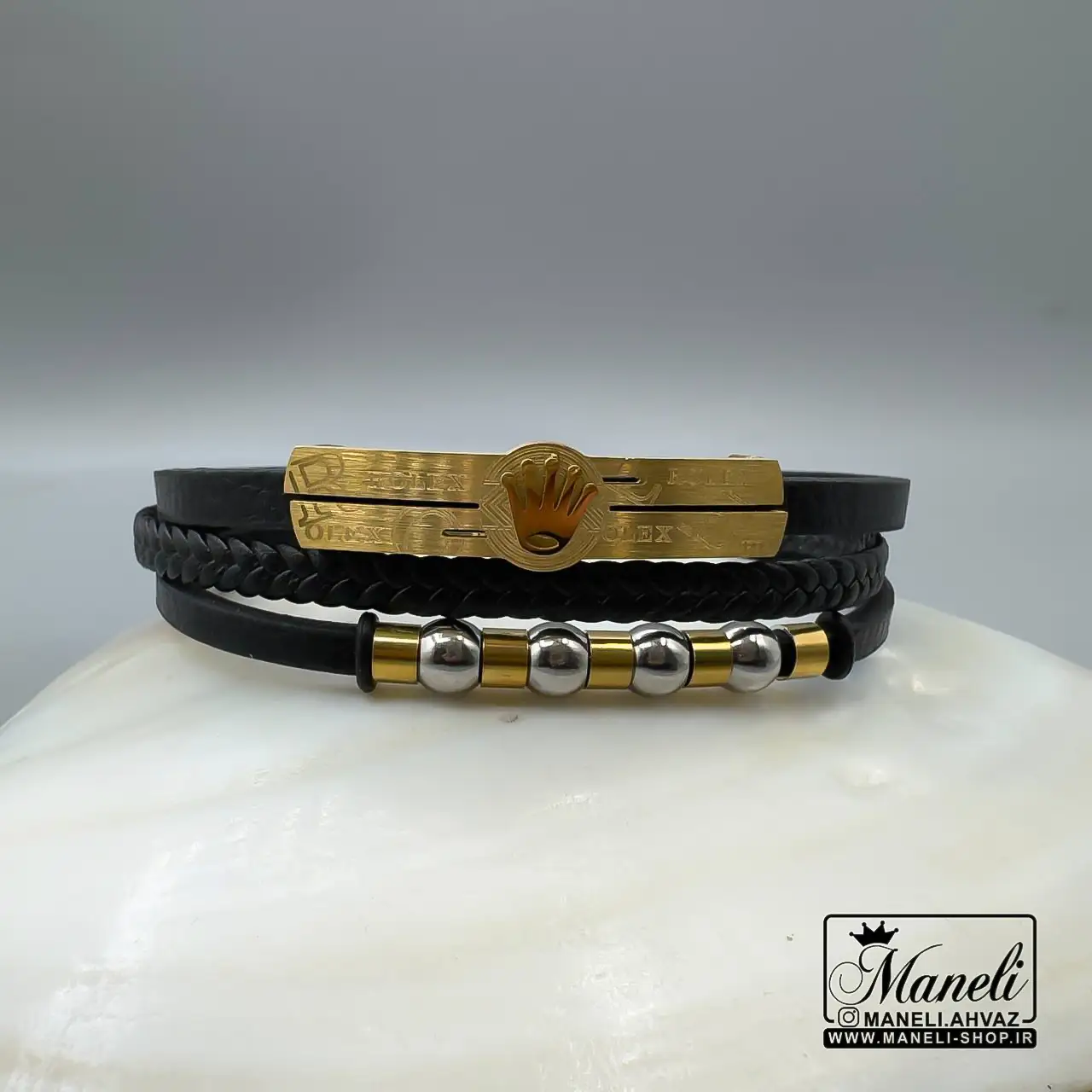 دستبند چرم رولکس مشکی و طلایی: همراهی شیک برای مردان خوشاستایل
