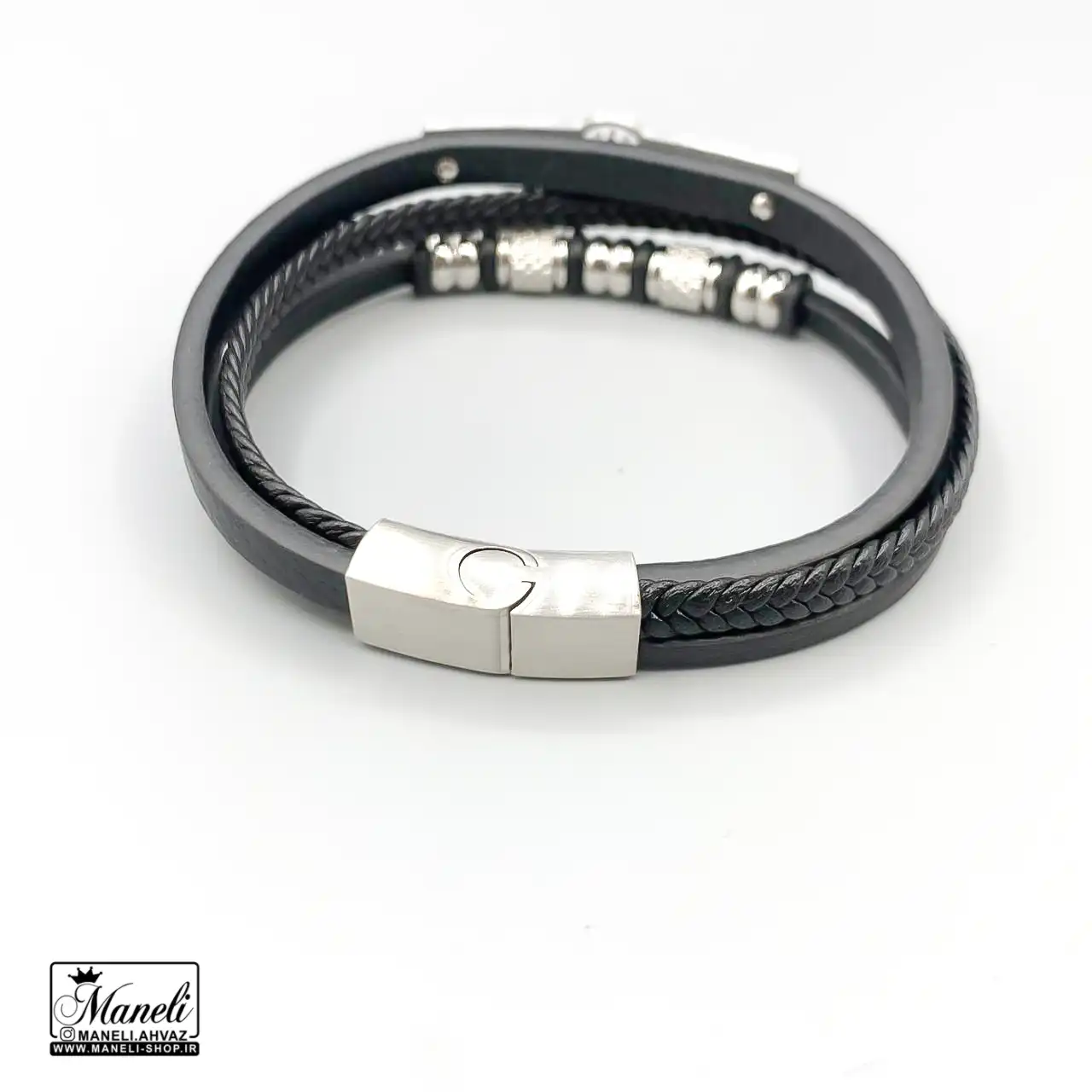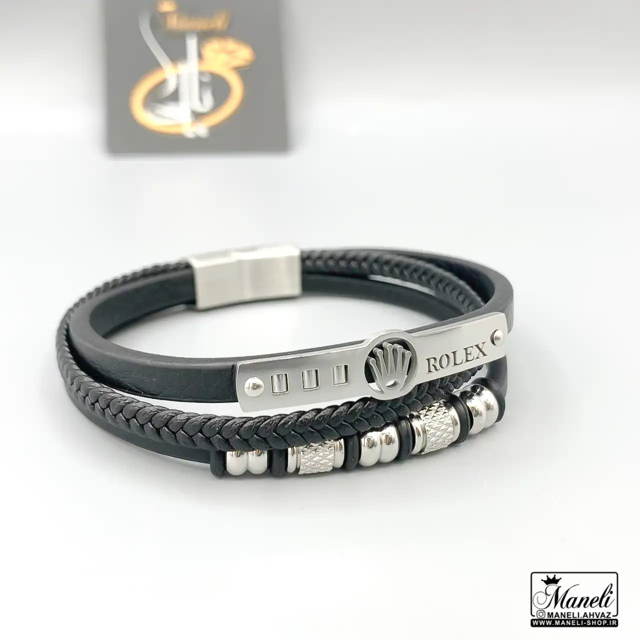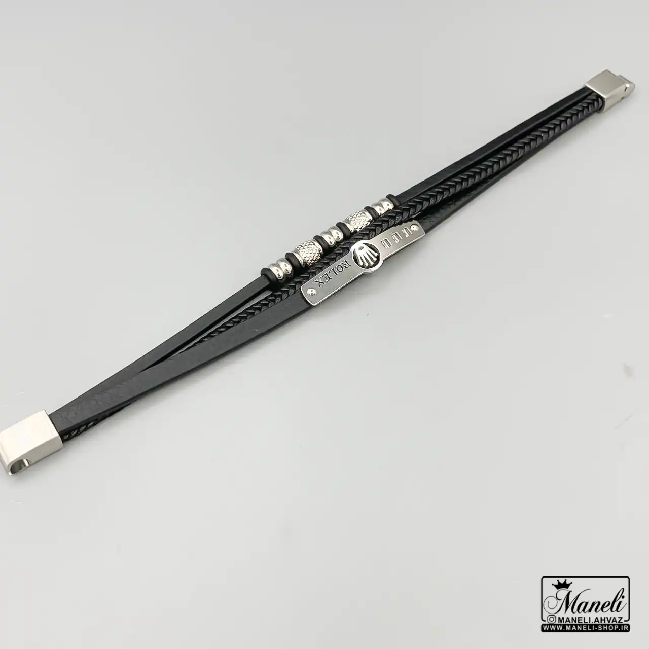 دستبند چرم پسرانه سه ردیفه با پلاک رولکس نقره ای 14040838