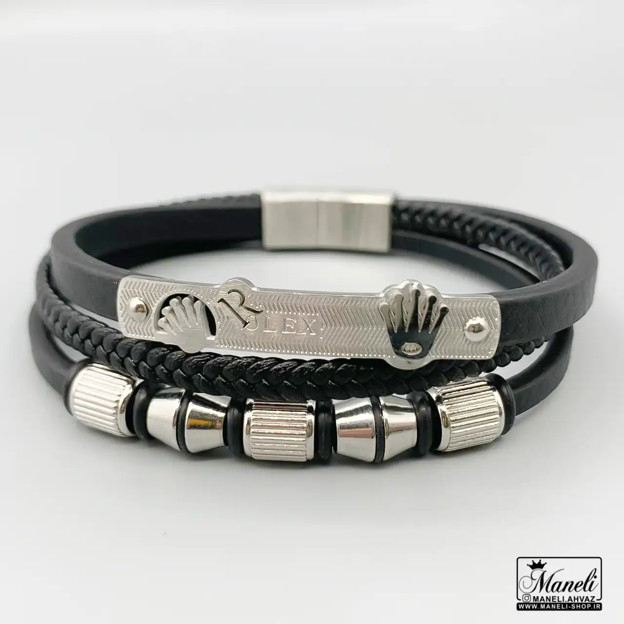 دستبند چرم پلاک دار سه ردیفه با نماد رولکس نقره ای؛ تجسم قدرت، استایل و اصالت مردانه