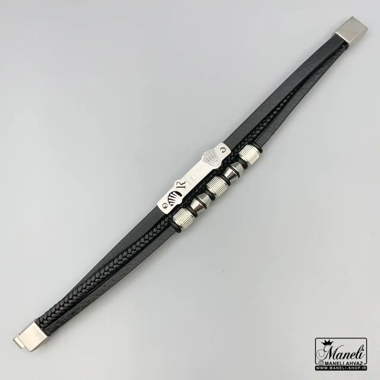 دستبند چرم پلاک دار سه ردیفه با نماد رولکس نقره ای 14040842