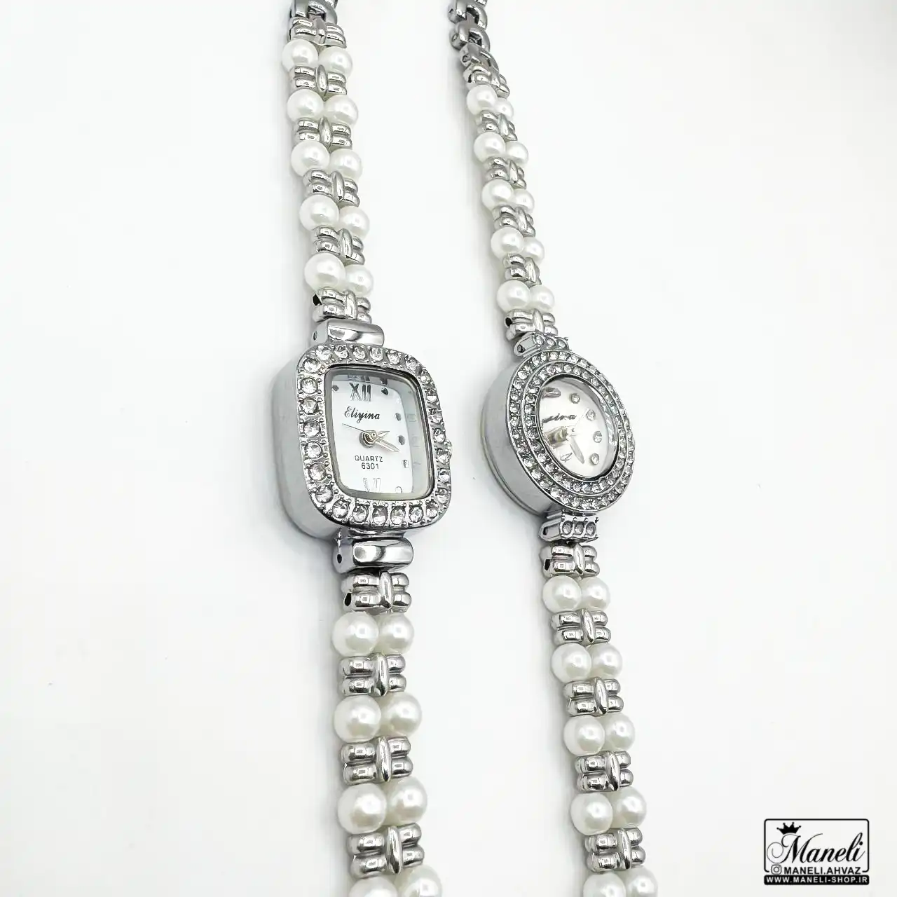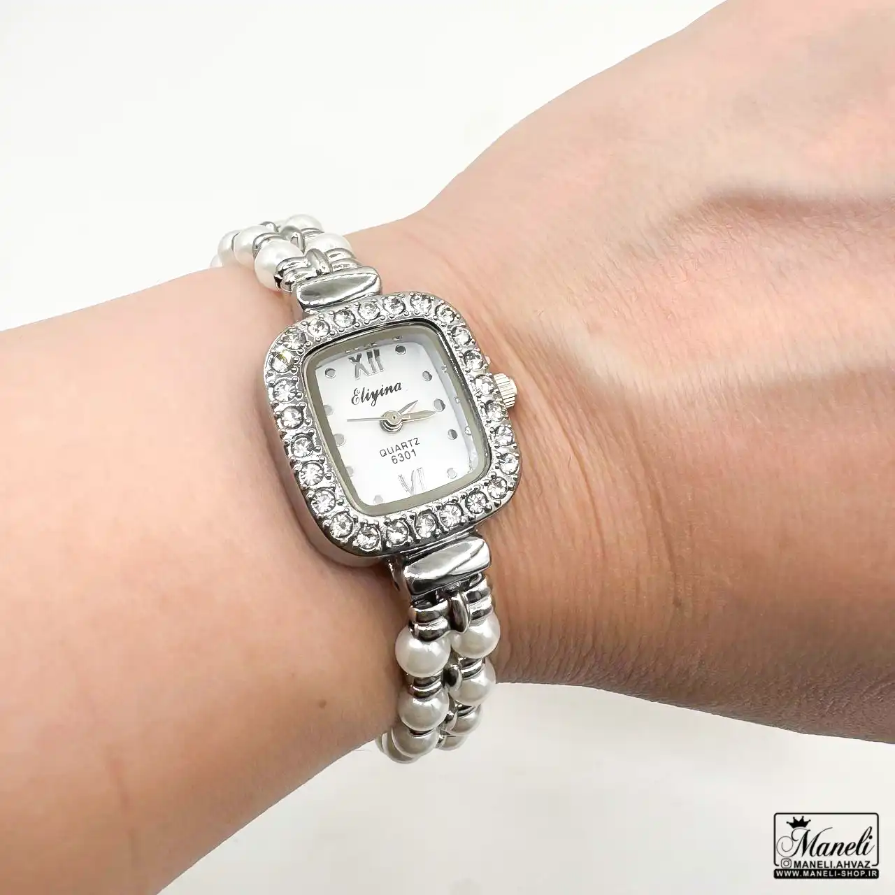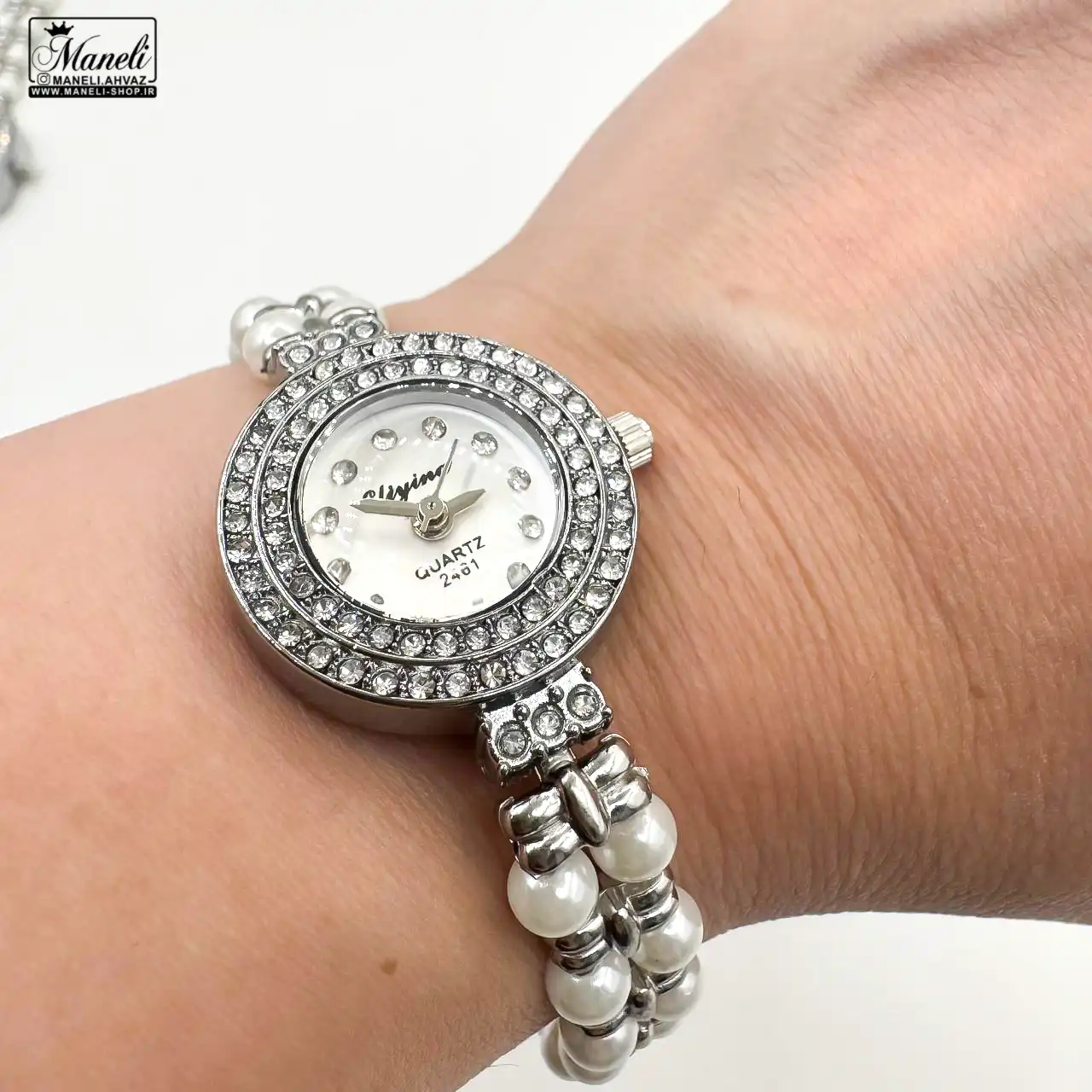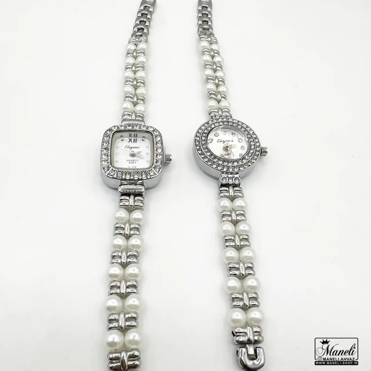 ساعت زنانه مرواریدی نقره‌ای | ظرافت و درخشش در دو طرح مربع و گرد