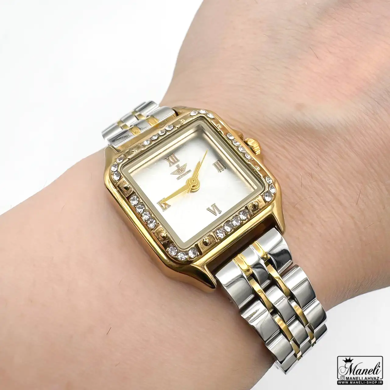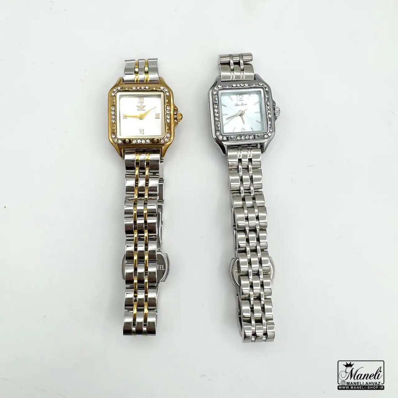 ساعت صفحه مربع زنانه قاب نگین دار | نقره ای و طلایی نقره ای