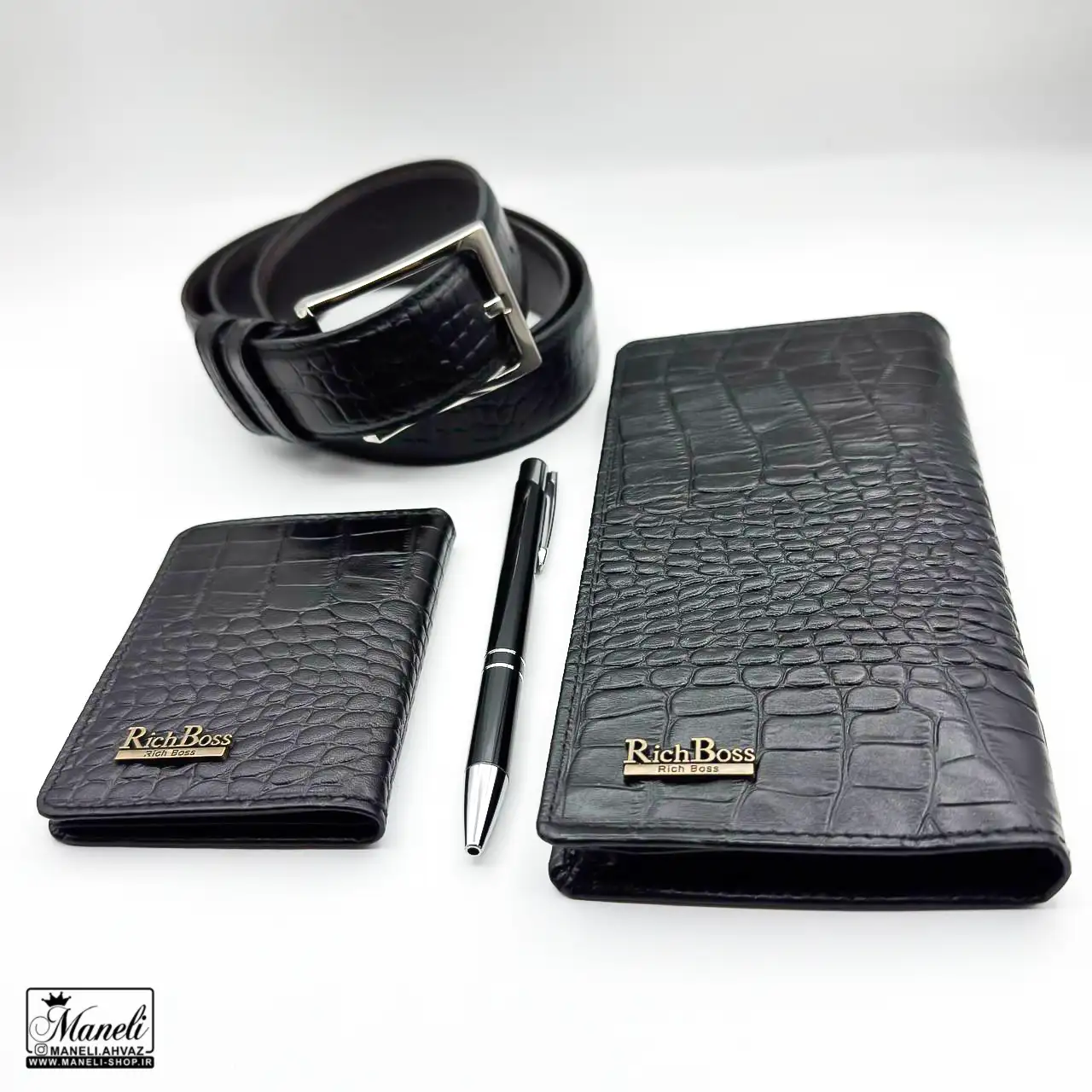 ست چرم طبیعی مردانه کیف ، کمربند ، جاکارتی ، خودکار | رنگ مشکی