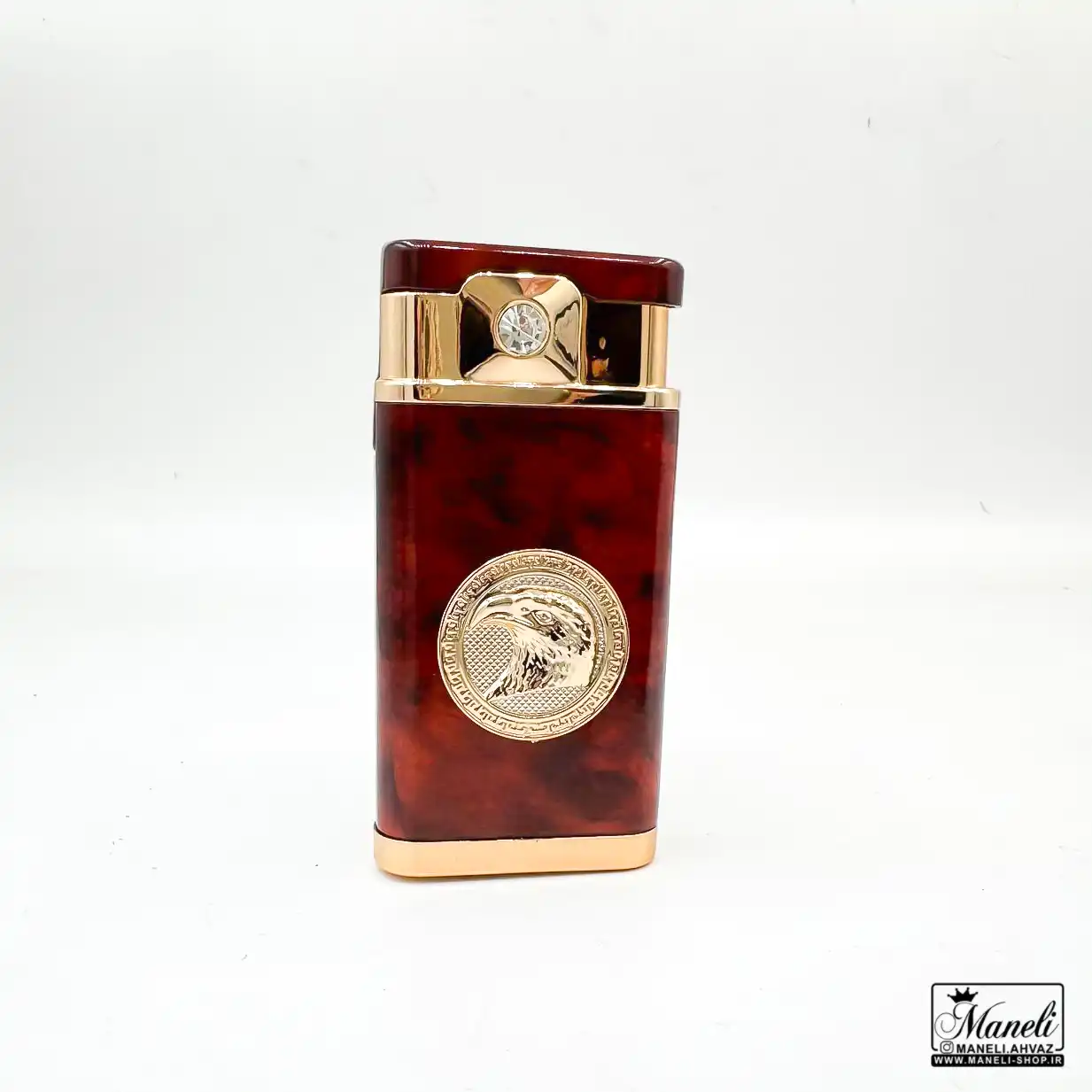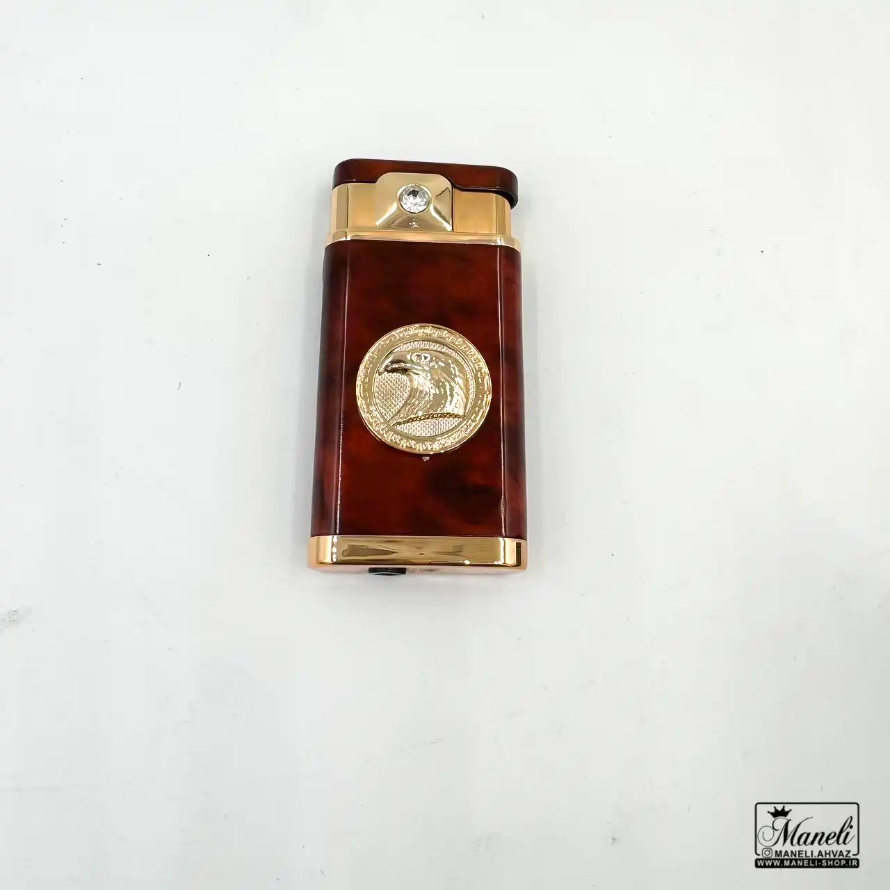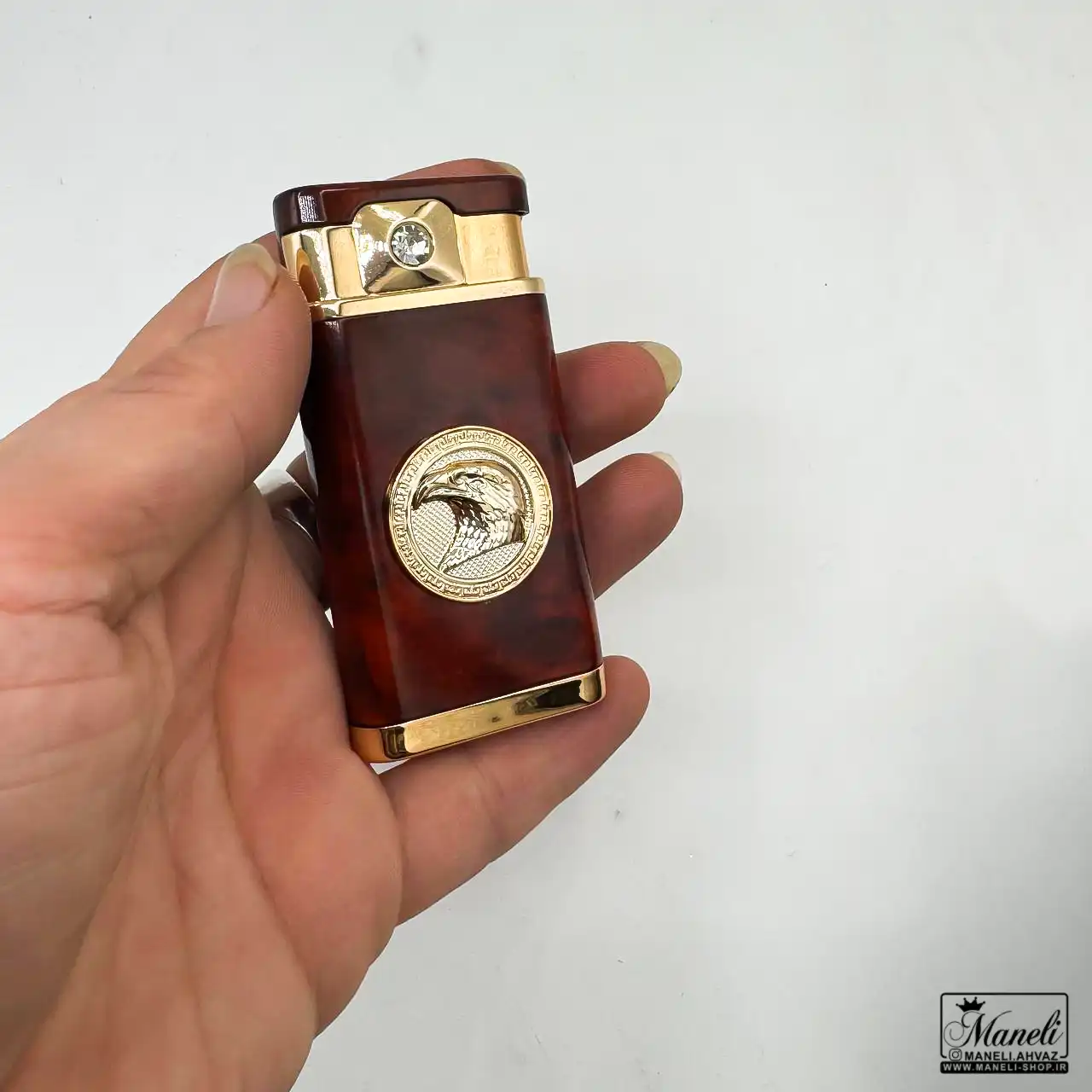 این فندک منحصربهفرد، با طراحی خیرهکننده خود، یک اکسسوری لوکس و کارآمد به شمار میرود. در مرکز بدنه فلزی و مستحکم آن، یک طرح سر عقاب طلایی با جزئیات دقیق و چشمنواز قرار گرفته است که نمادی از قدرت، آزادی و شکوه است. این نقش برجسته طلایی، تضادی دلنشین با بدنه اصلی فندک ایجاد میکند. بدنه فندک، با رنگ قهوهای گرم و طرح چوبی بسیار واقعگرایانه، حس نوستالژی و اصالت را به ارمغان میآورد و آن را از سایر فندکهای موجود در بازار متمایز میسازد. در قسمت بالایی بدنه، نزدیک به درب فندک، یک نگین ظریف و درخشان کار شده که جلوهای لوکس و خاص به این اکسسوری میبخشد. جنس تمام فلزی این محصول، دوام و طول عمر بالای آن را تضمین میکند و تجربهای لذتبخش از استفاده را برای شما به ارمغان میآورد.