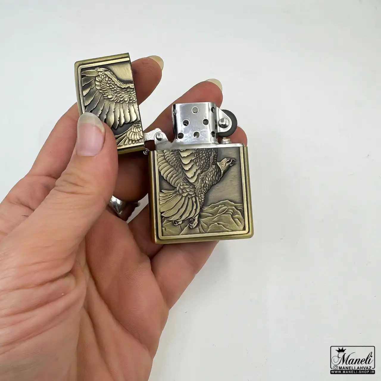 - فندک بنزینی فلزی با طرح برجسته عقاب: قلب تپنده این مجموعه، فندکی باکیفیت و مقاوم که با طرح بینظیر عقاب تزئین شده است.
